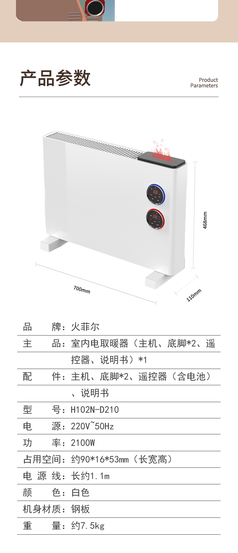 "商品名称:火菲尔远红外石墨烯取暖器(7天免费试用,终身保修) 主品:室内电取暖器(主机、底脚*2、遥控器、说明书)*1 赠品:无 包装方式:商品配件同一包装