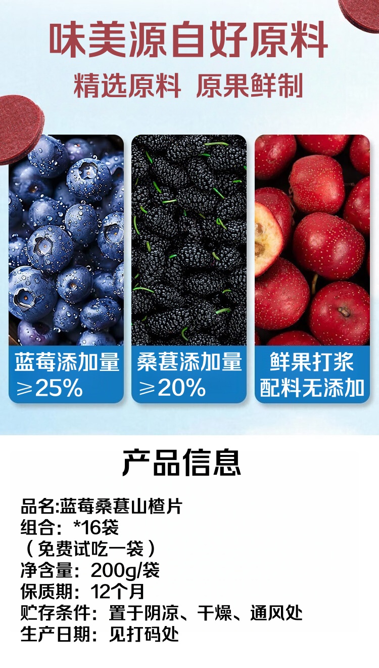主商品名称/件数:蓝莓桑葚山楂片*16袋;