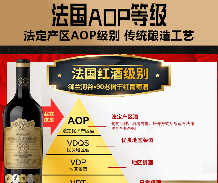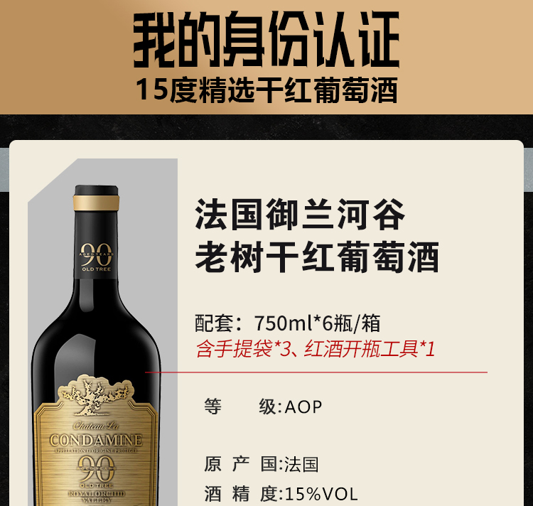 法国御兰河谷老树干红葡萄酒750ml*6瓶,手提袋*3个,红酒开瓶工具*1个"